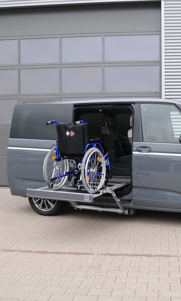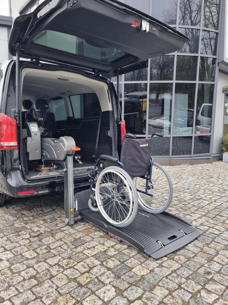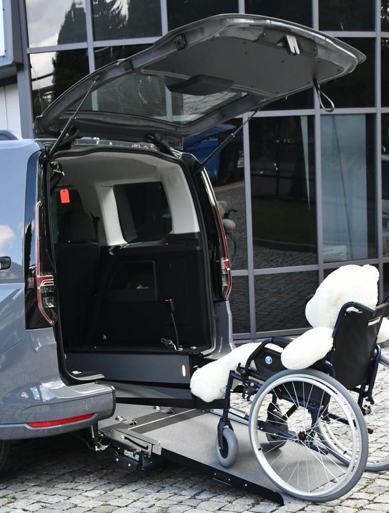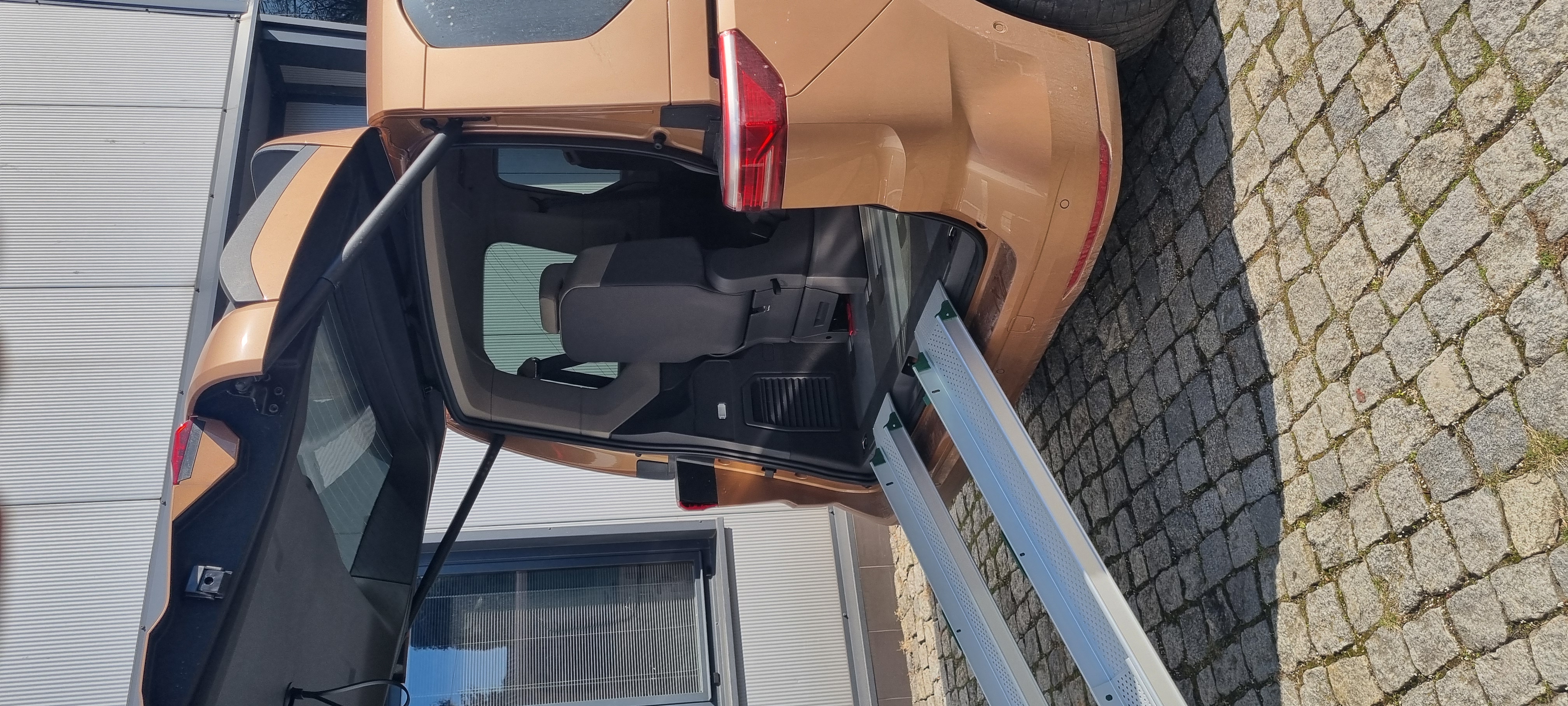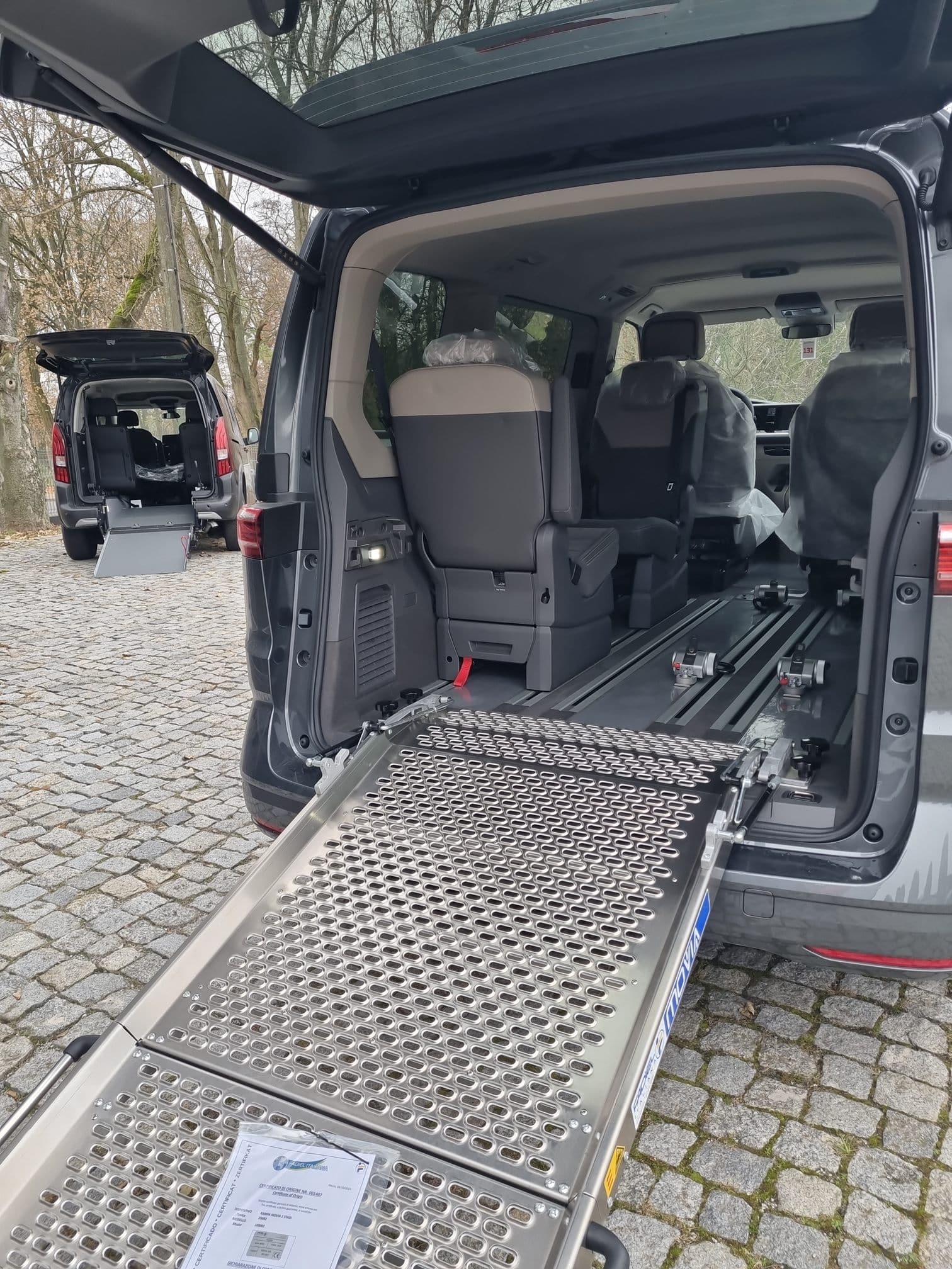 Samochody z rampą dla osób niepełnosprawnych na wózkach. Rampy składane ręcznie, umożliwią wprowadzenie przez opiekuna, osobę niepełnosprawną na wózku do wnętrza samochodu.