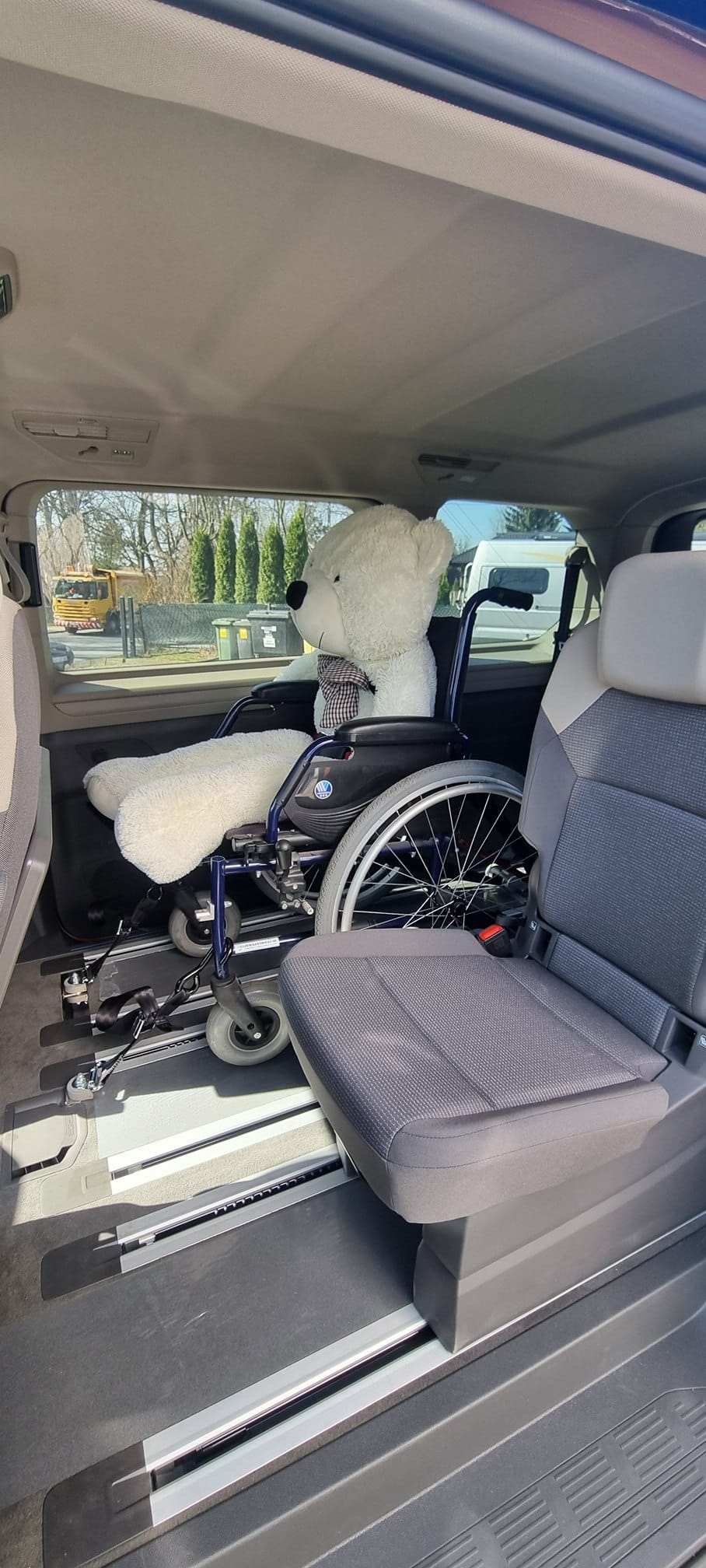 Najprostsze przystosowanie samochodu do przewozu na wózku osoby niepełnosprawnej, poprzez montaż najazdów oraz pasów mocowania wózka wraz z pasem bezpieczeństwa dla osoby na wózku.